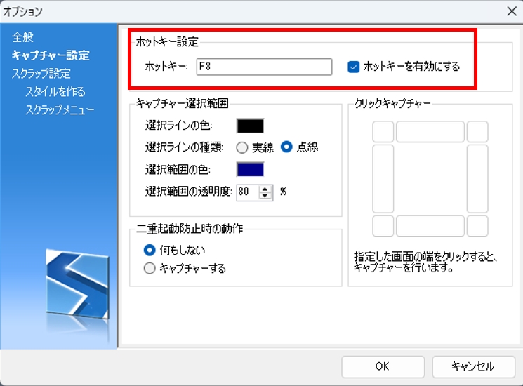 左のツリーから「キャプチャー設定」に移動しホットキーを設定します。ホットキーとはSETUNAを起動させるショートカットキーです、このキーを押すとほかのソフトを起動中でもキャプチャーが立ち上がってくれます。私の環境ではF3キーがどのソフトとも競合しなかったのでこの設定にしています。複数のキー同時押しも対応しています。