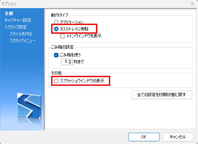 「タスクトレイに常駐」を選択し「スプラッシュウィンドウの表示」のチェックを外します。