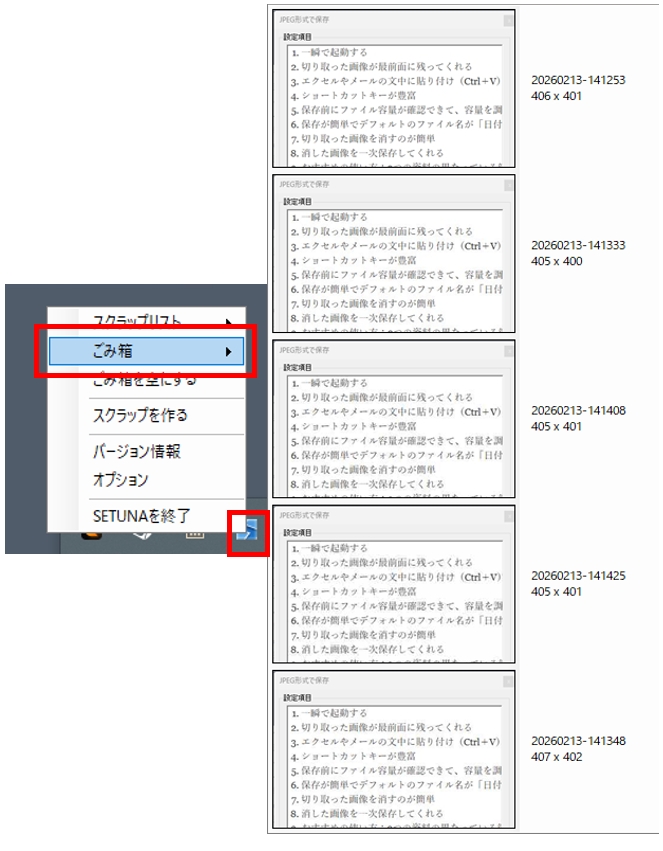 間違ってキャプチャーを消してしまってもタスクトレイのSETUNAのアイコンを右クリックでメニューを表示しゴミ箱を選択すると直近で消したキャプチャーの一覧があり、ここから復活させることができます。保存数はオプションから変更可能です。