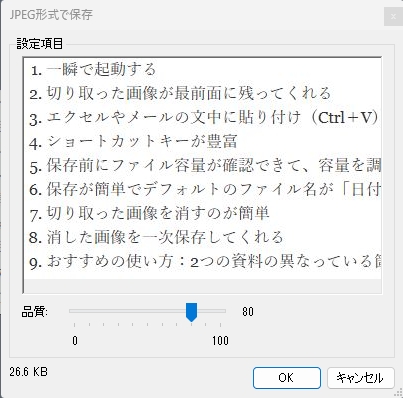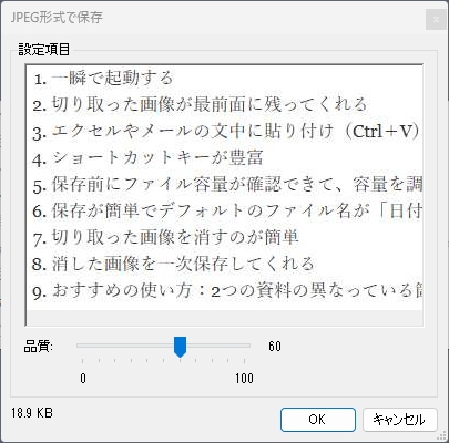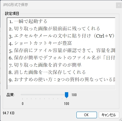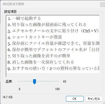 キャプチャーを画像(.jpg)として保存するには「Ctrl+S」を押します。すると保存画像のプレビュー、品質選択のスライドバーそして左下にファイルサイズが表示されます。