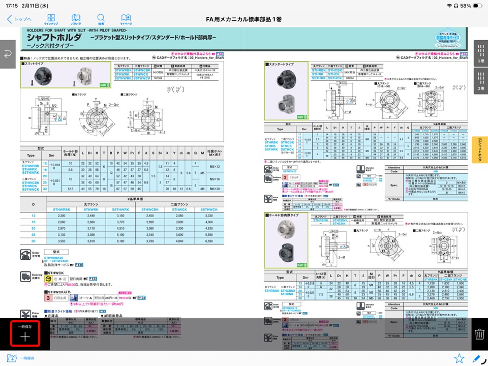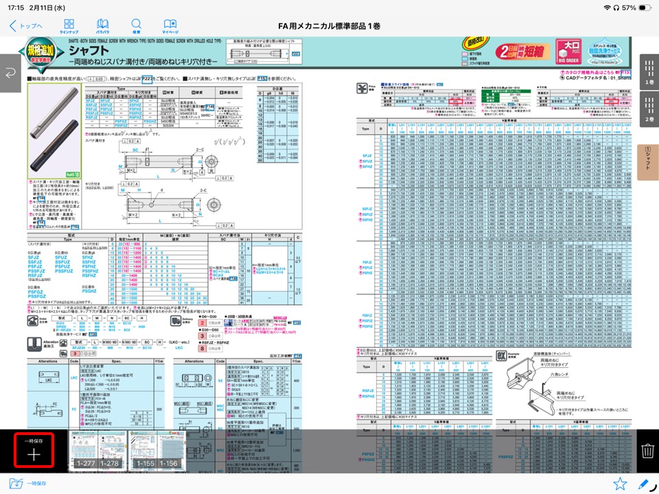 紙カタログの最大の利点はこれでした、特にボールねじ関係を選定している時はボールねじ、サポートユニット、カップリングを行ったり来たりして選定していました。この動作が電子カタログでできます。まずはなにもないところタップしてメニューを表示させ、「一次保存」をタップします。