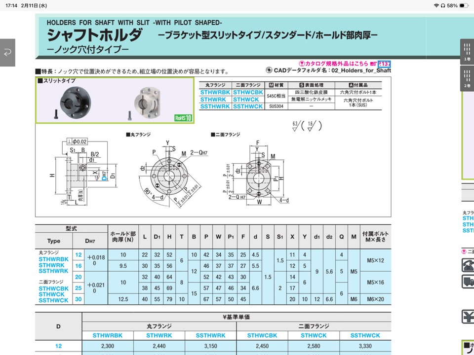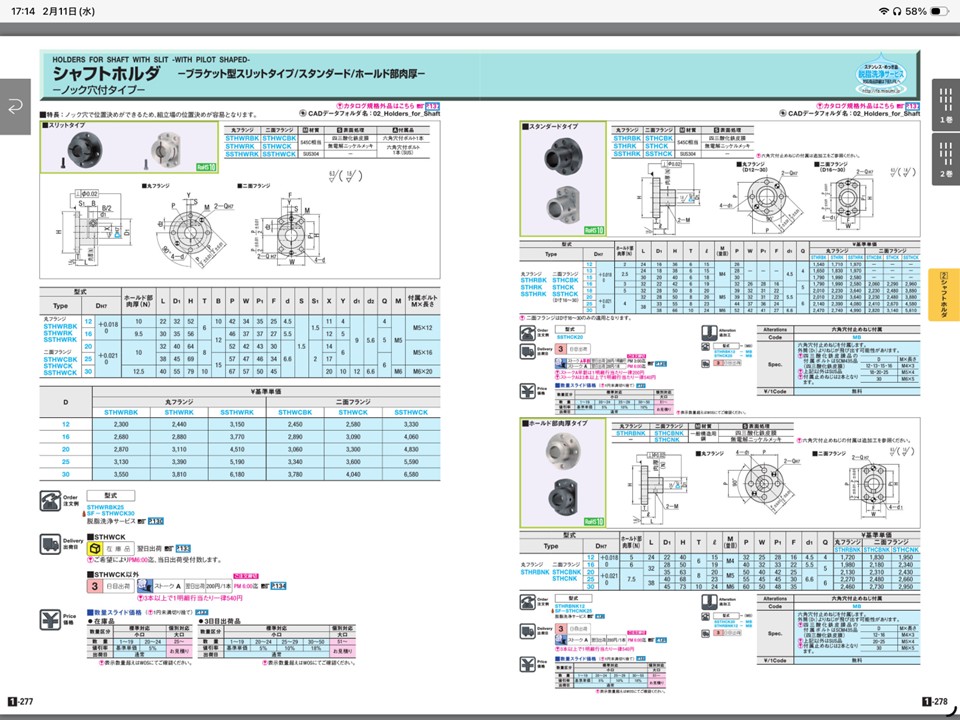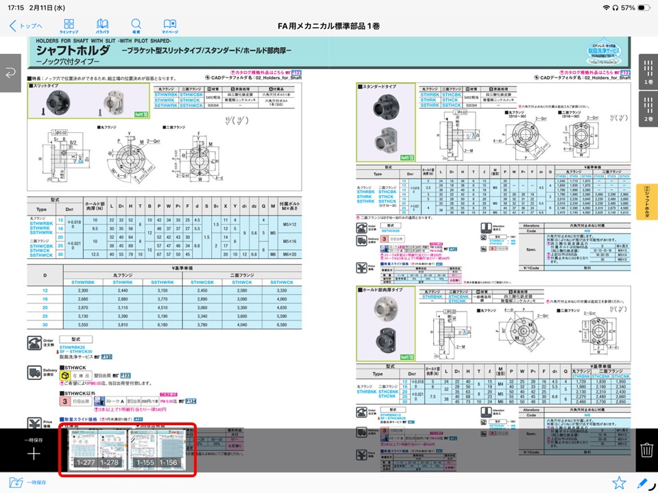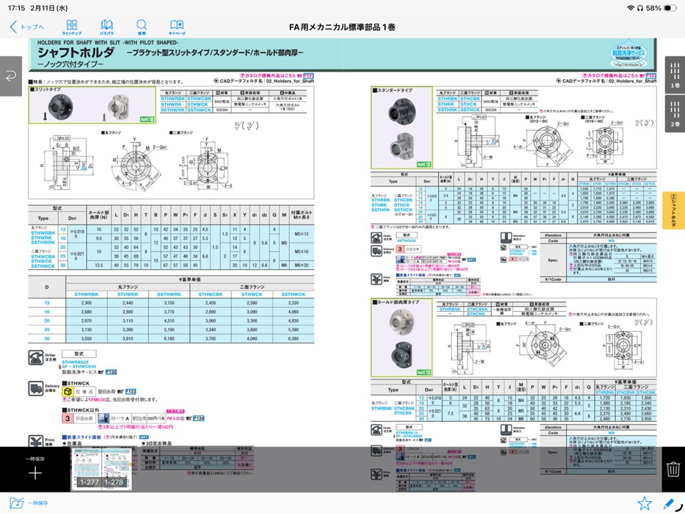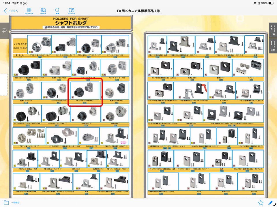 紙カタログ1ページ目と同じくカテゴリ一覧が出てきますので、探したい項目を選択します、今回はシャフトホルダを例に挙げます。ここの順番は紙カタログと一緒でなおかつ1巻と2巻が一緒に表示されます。