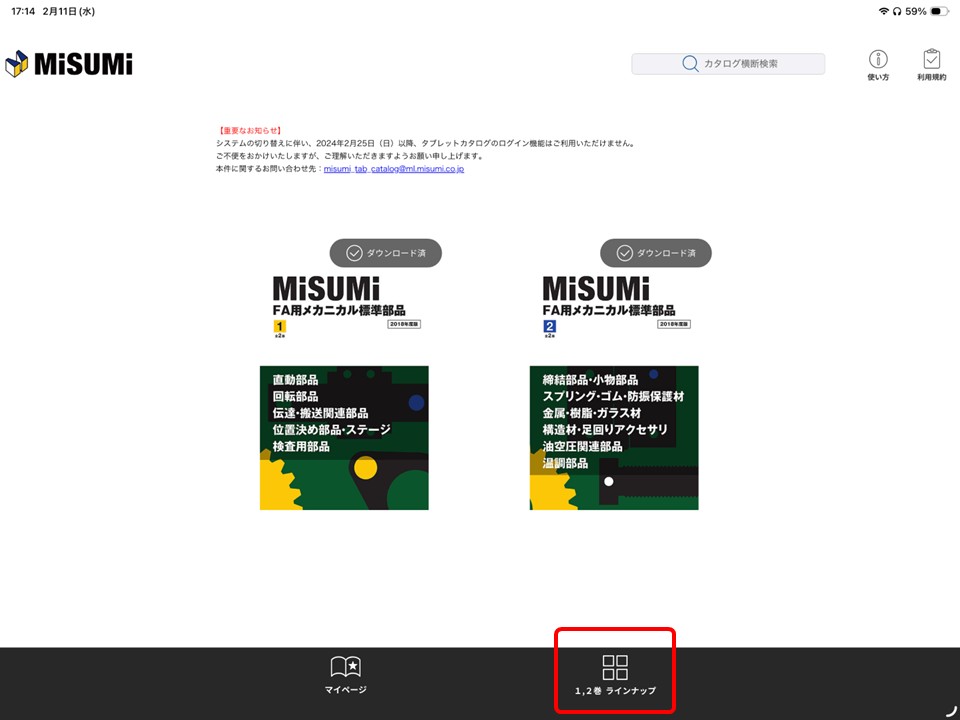 型式を探す方法ですが、まずアプリを開いたら右下の「1,2巻ラインナップ」を選択します。
