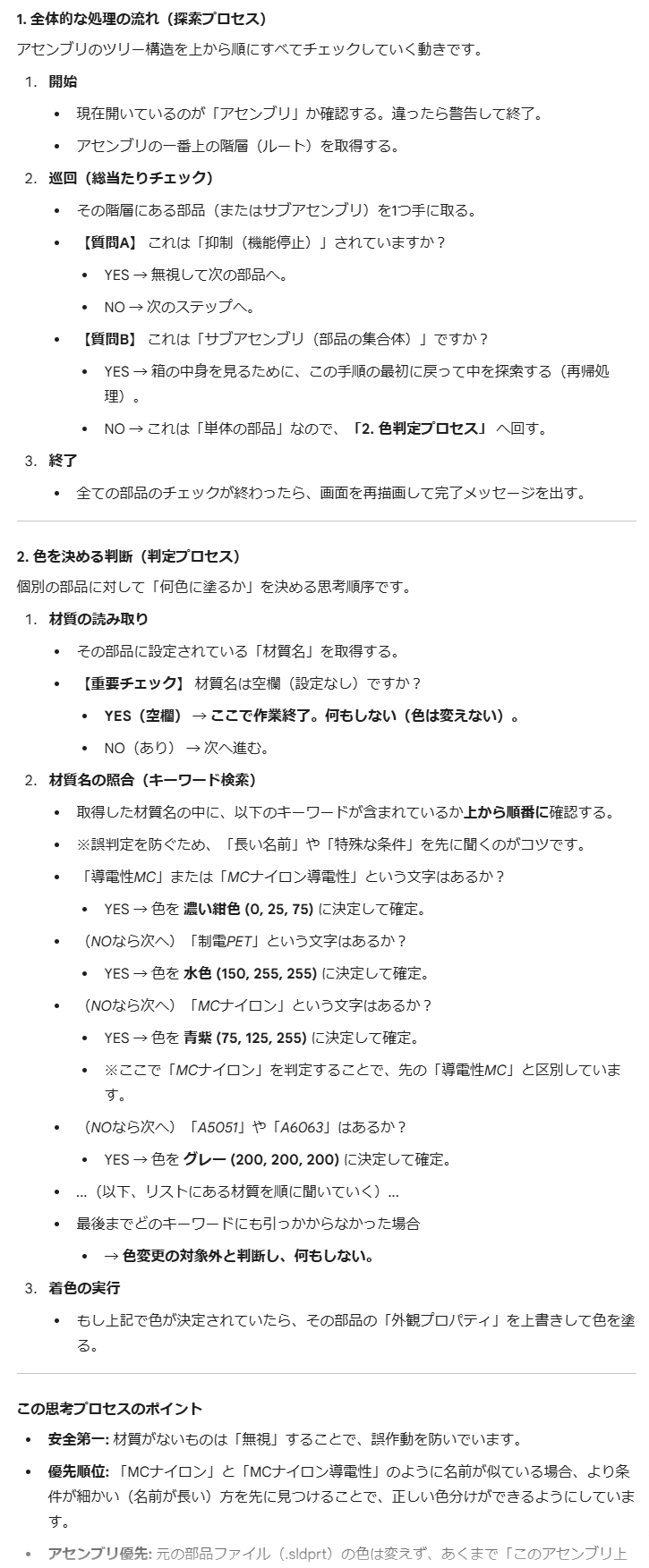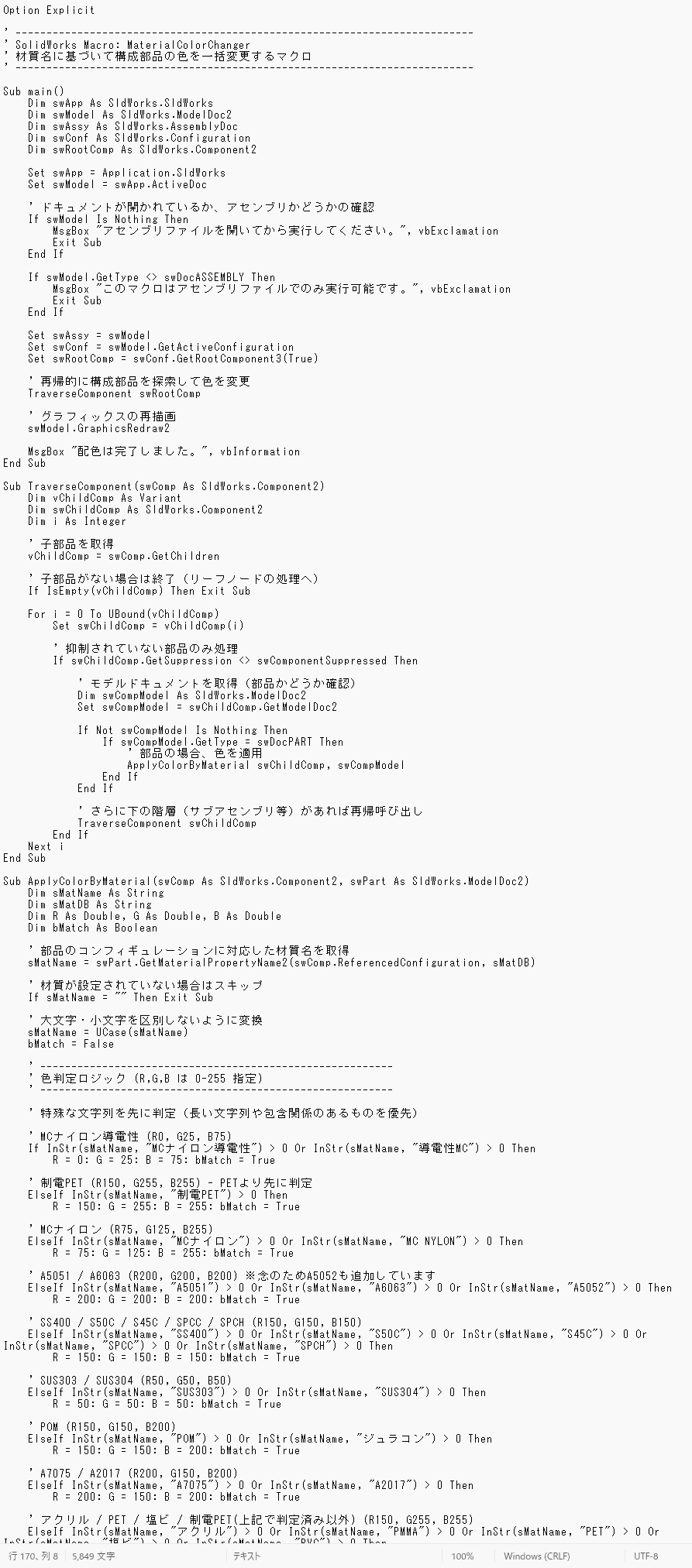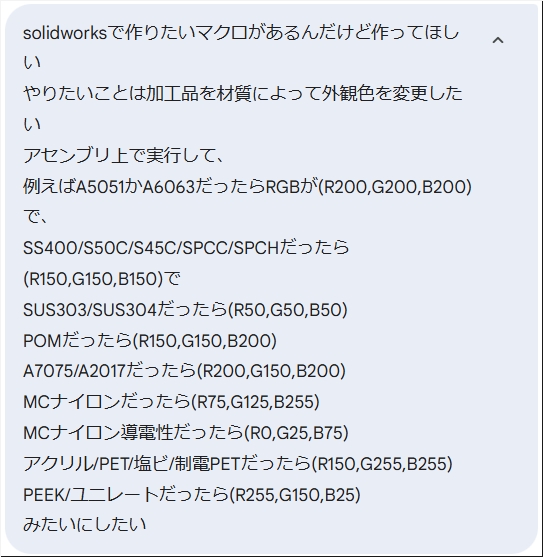 これを改善するために加工品の外観色を材質毎に統一すれば、設計者以外でも一目で判断がつくのではないかというアイディアがありましたが、これを手動で設定していくのは効率が悪くなかなか実現できずにいました。