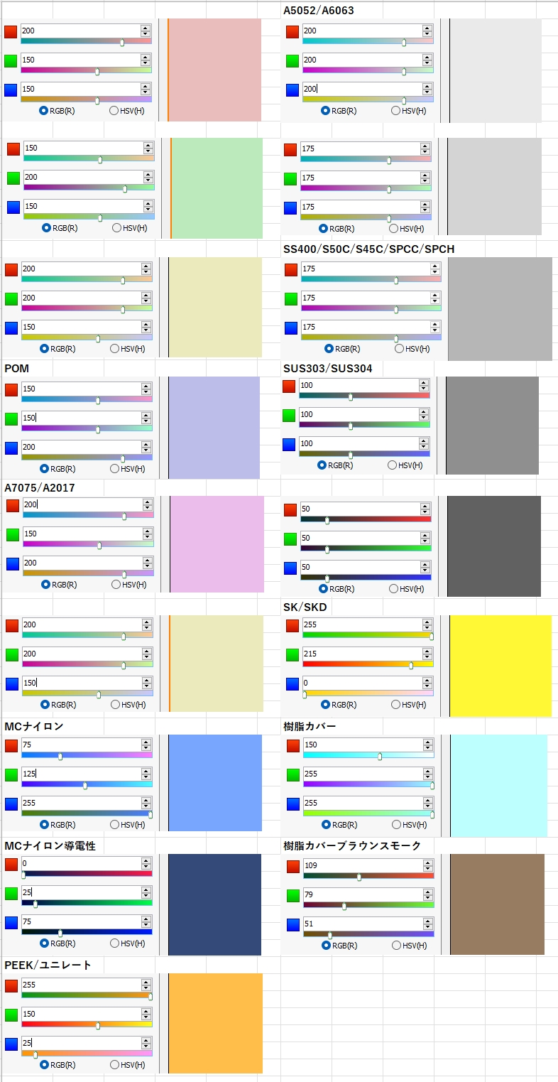 後で変更できるのでとりあえずたたき台のつもりで色を決めます。Solidworksの外観編集からいろいろRBGを変化させ区別がつきそうな色を切り出していき、その中からよく使用する材質を何色にするか決めました。